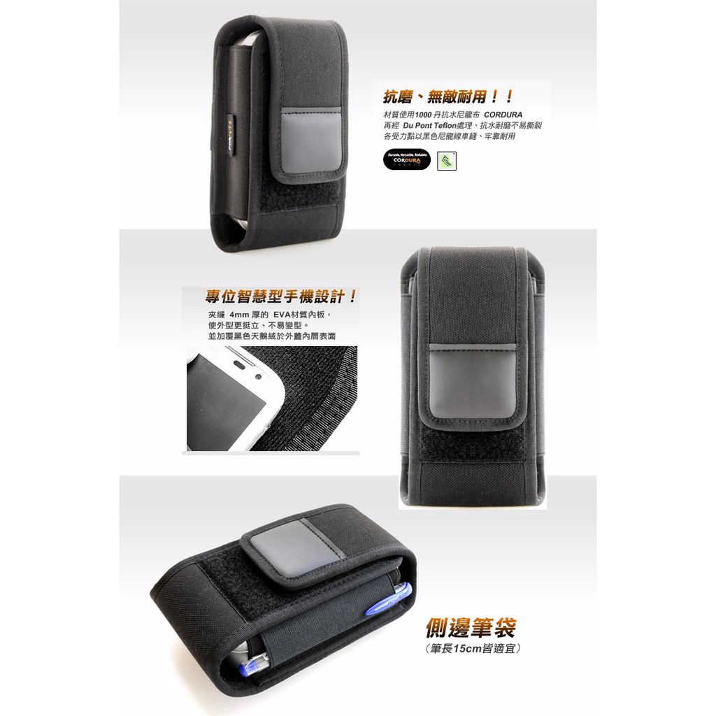 材質:使用1000丹CORDURA 尼龍布材質,耐抗磨、不易撕裂、不易褪色,再經過DuPont Teflon抗潑水處理,夾縫4 mm厚的EVA材質內板,使外型更挺立、不易變型。並加覆黑色天鵝絨於外蓋內層表面,觸感良好。外蓋加車縫的軟性仿皮革,即使多次掀蓋也不易變形,以魔鬼粘作為開閤,可依放置的物品高度任意調整外蓋的長短,取物時方便又迅速!  外層:側邊再加縫一層的伸縮帶可放置筆類等..