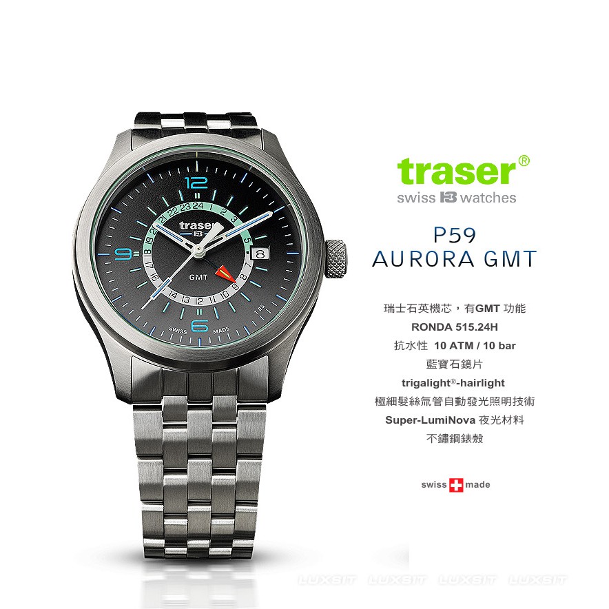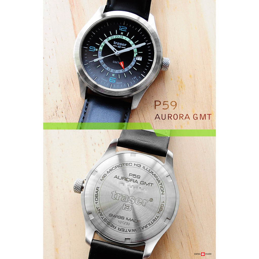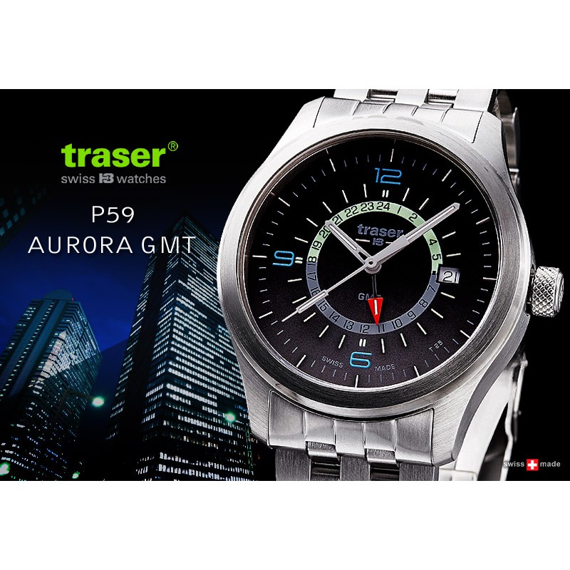 P59 Aurora 極光GMT 系列錶款,適合環球旅行者、經常性旅行、戶外愛好者以及建立積極生活方式的每個人。極細髮絲氚管自動發光照明技術使用在時標和指針,夜光材料使用在GMT 上半圈指標環、數字和鏡片膠圈上。