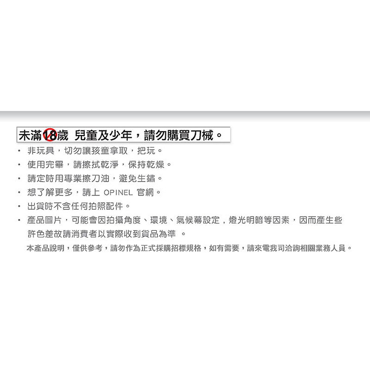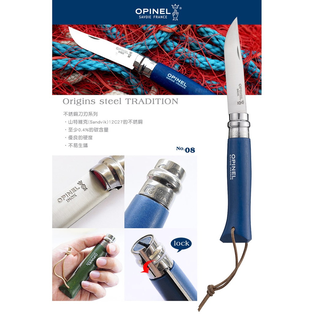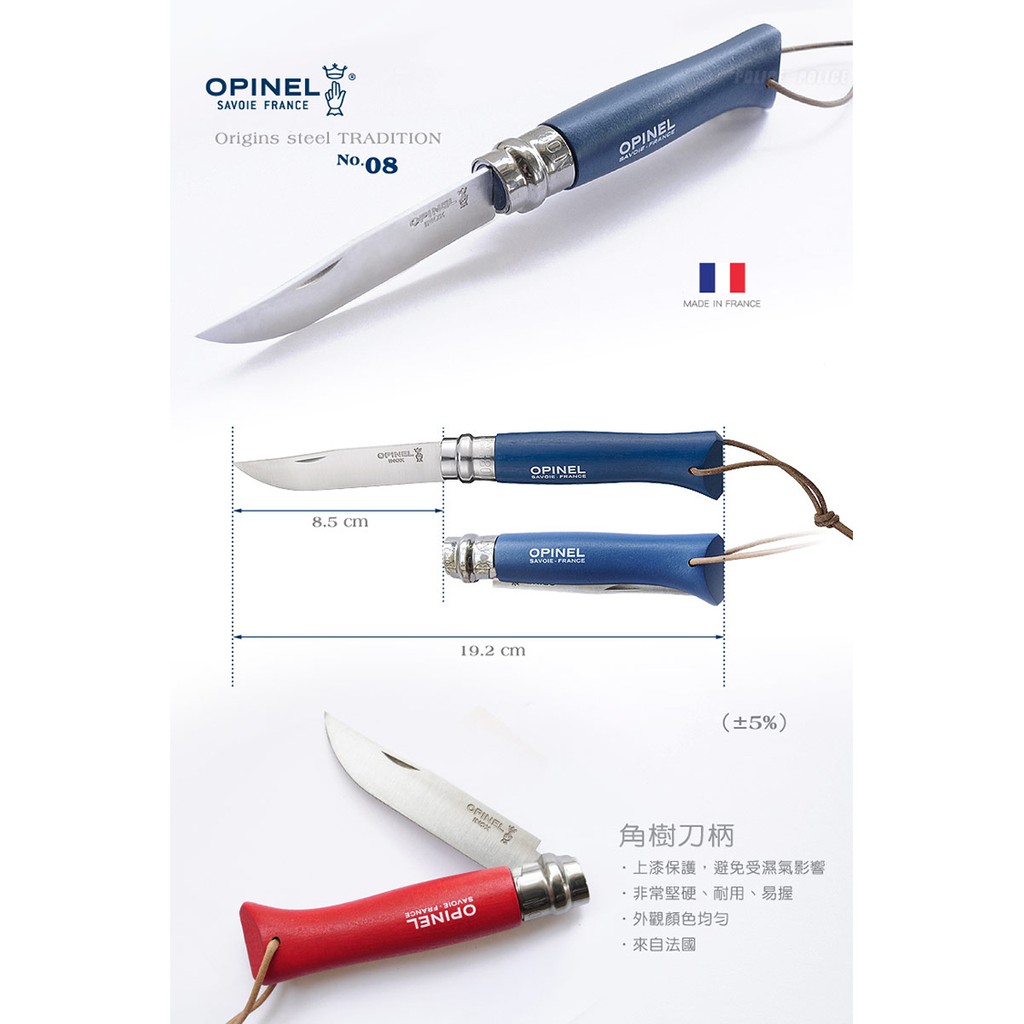 品名:OPINEL Origins steel TRADITION 法國不銹鋼刀原創附皮繩No.08系列 型號:OPI_001705紅色 尺寸( ±5﹪): 刀刃長8.5 cm、全長約19.2cm 重量( ±5﹪): 約50g 》不銹鋼刀刃系列 山特維克(Sandvik)12C27的不銹鋼 至少0.4%的碳含量 優良的硬度 不易生鏽 》角樹刀柄 上漆保護,避免受濕氣影響 非常堅硬、耐用、易握 外觀顏色均勻 來自法國 ※未滿18歲 兒童及少年,請勿購買刀械。 ※此款為紅色款式,其他顏色和商品為示意說明圖 |