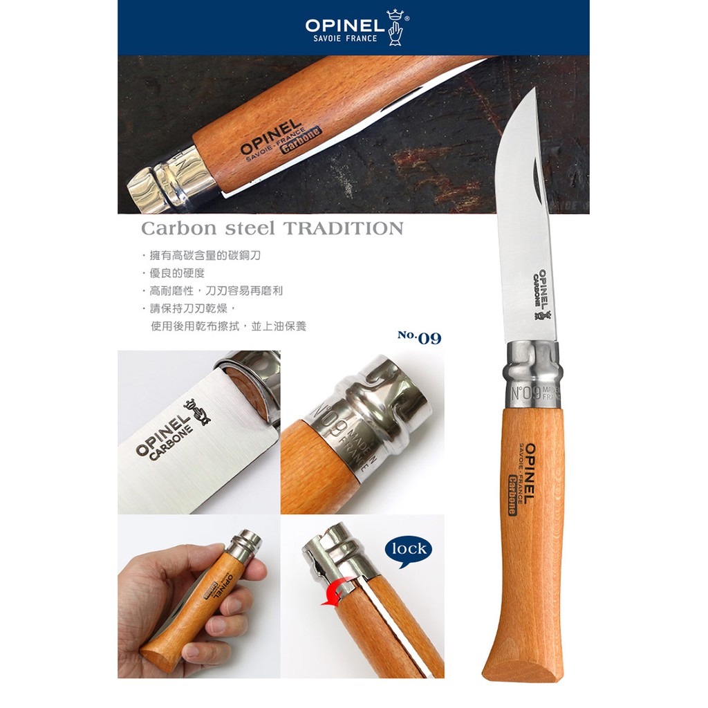 | ※以下原廠提供參考數據 品名:OPINEL Carbon steel TRADITION 法國刀碳鋼系列(No.9 #OPI_113090) 型號:#OPI_113090 尺寸( ±5﹪): 刀刃長9 cm、全長21 cm 重量( ±5﹪):56 g 》碳鋼刀刃系列 ˙擁有高碳含量的碳鋼刀 ˙優良的硬度 ˙高耐磨性 ˙容易再磨 ˙別讓刀片碰到水 ˙使用後用乾布擦拭,並上油保養 》櫸木刀柄 ˙櫸木是OPINEL最常用來當刀柄的木材 ˙來自法國 ˙非常堅硬、耐用,便於工作 ˙有者均勻的外觀 ˙特色是有許多小且暗的短線在上面 ※未滿18歲 兒童及少年,請勿購買刀械。 |