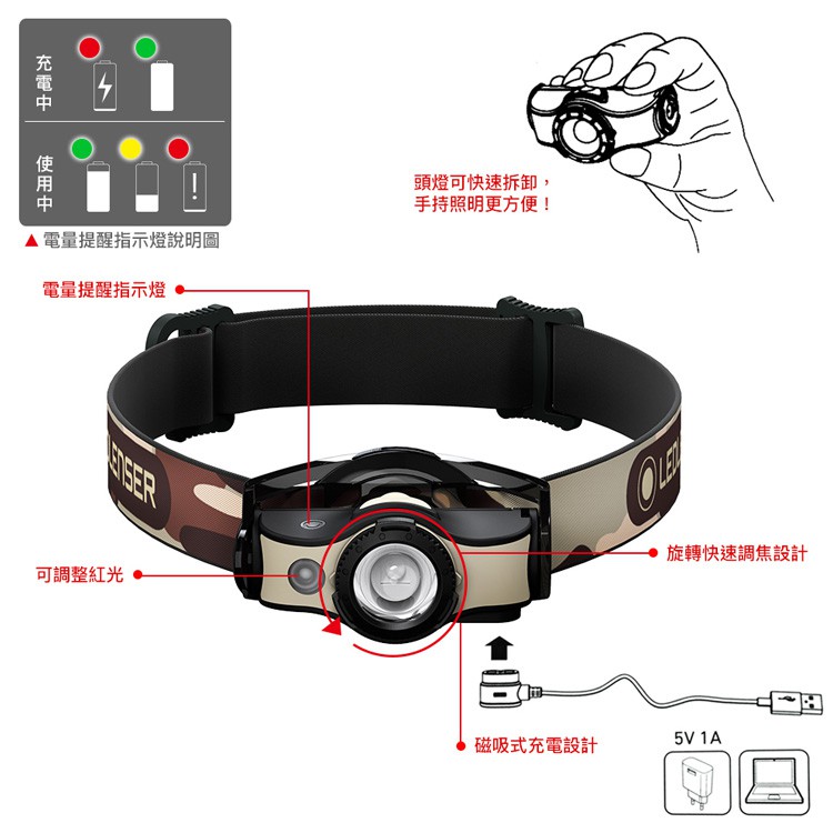 可快速將頭燈與固定座拆開,手持照明更方便。