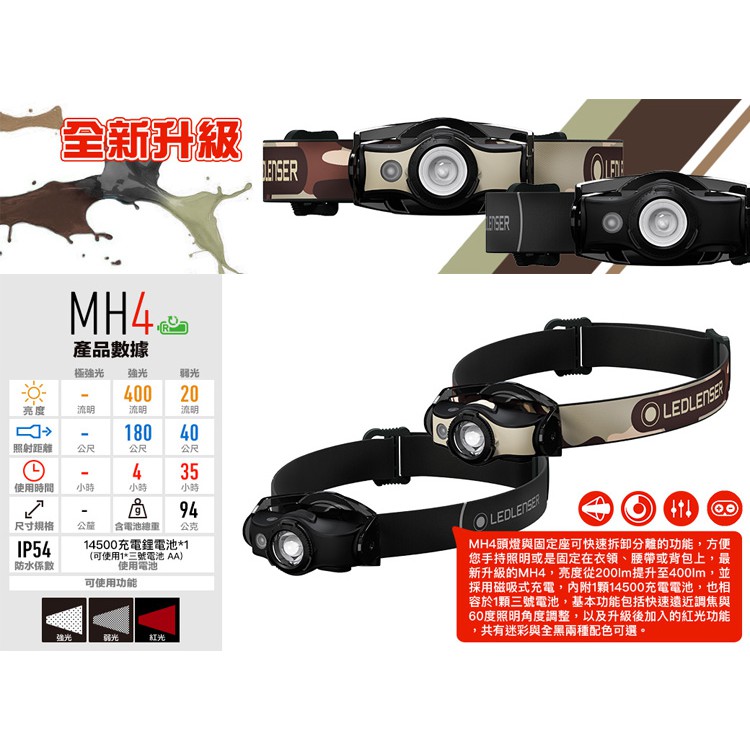 MH4 頭燈與固定座可快速拆卸分離的功能,方便您手持照明或是固定在衣領、腰帶或背包上,最新升級的 MH4,亮度從200lm提升至400lm,並採用磁吸式充電,內附1顆14500充電電池,也相容於1顆三號電池,基本功能包括快速遠近調