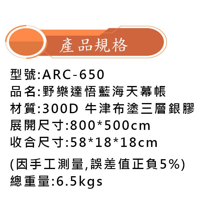 丹大戶外【Camping Ace】 野樂達悟藍海天幕帳 ARC-650