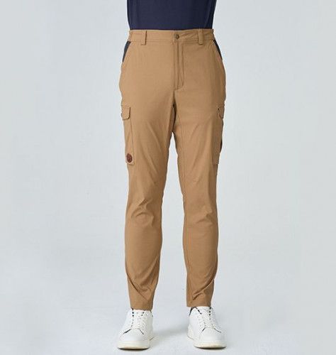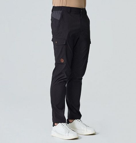 同布種拼接 / 左右不對稱貼袋 / 膝圍處車摺及褲底三角岔布增加活動量 / 側袋鹿頭皮標裝飾 / 左後膝下LOGO繡花