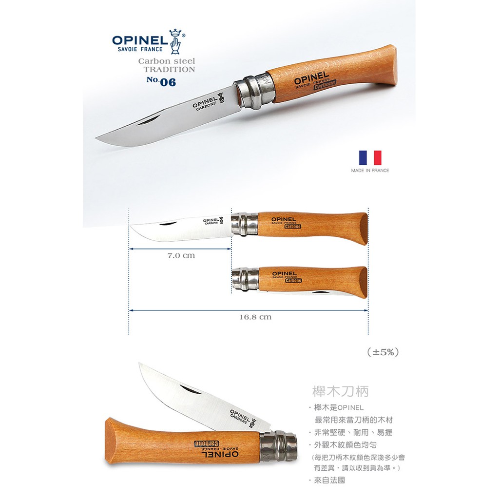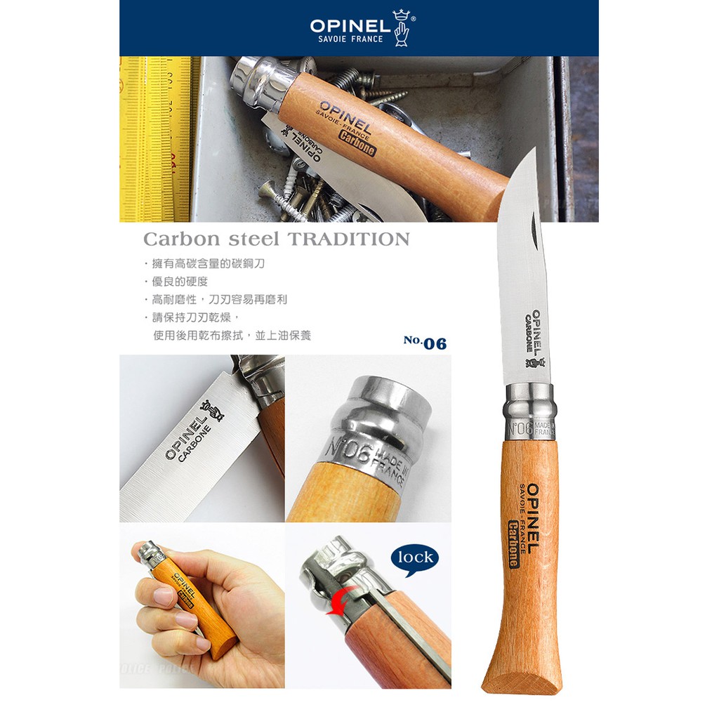 | ※以下原廠提供參考數據 品名:OPINEL Carbon steel TRADITION 法國刀碳鋼系列(No.6 #OPI_113060) 型號:#OPI_113060 尺寸( ±5﹪):刀刃長7 cm、全長16.8 cm 重量( ±5﹪):26 g 》碳鋼刀刃系列 ˙擁有高碳含量的碳鋼刀 ˙優良的硬度 ˙高耐磨性 ˙容易再磨 ˙別讓刀片碰到水 ˙使用後用乾布擦拭,並上油保養 》櫸木刀柄 ˙櫸木是OPINEL最常用來當刀柄的木材 ˙來自法國 ˙非常堅硬、耐用,便於工作 ˙有者均勻的外觀 ˙特色是有許多小且暗的短線在上面 ※未滿18歲 兒童及少年,請勿購買刀械。 |