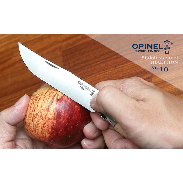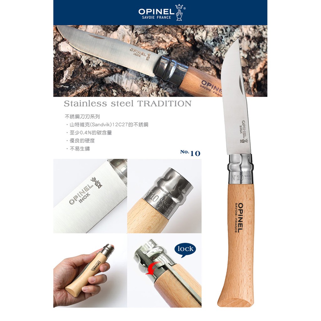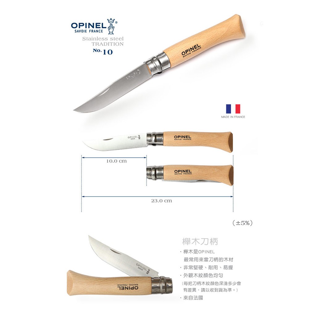 本商品規格※以下原廠提供參考數據 品名:OPINEL Stainless steel TRADITION 法國刀不銹鋼系列(No.10 #OPI_123100)型號:#OPI_123100尺寸( ±5﹪): 刀刃長10 cm、全長23 cm重量( ±5﹪):70g》不銹鋼刀刃系列˙山特維克(Sandvik)12C27的不銹鋼˙至少0.4%的碳含量˙優良的硬度˙不易生鏽》櫸木刀柄˙櫸木是OPINEL 最常用來當刀柄的木材˙非常堅硬、耐用、易握˙外觀木紋顏色均勻˙來自法國 ※未滿18歲 兒童及少年,請勿購買刀械。