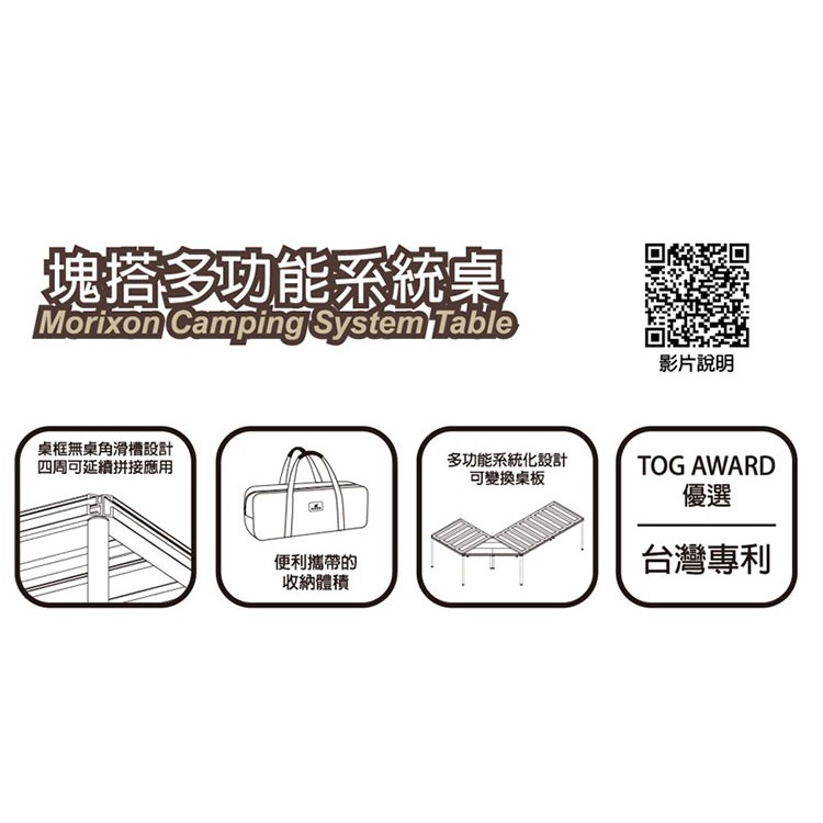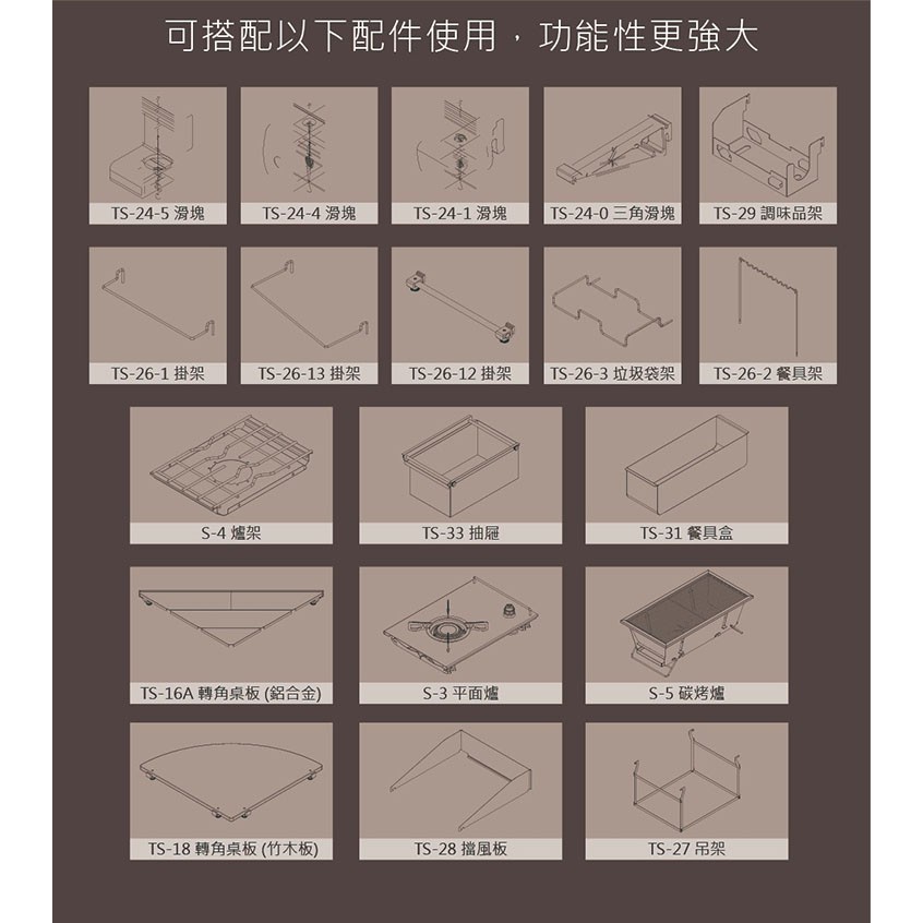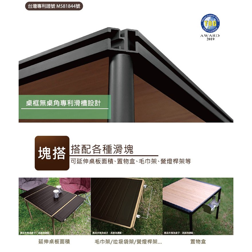 搭配各種滑塊,可延伸桌板面積、置物盒、毛巾架、營燈桿架等。
