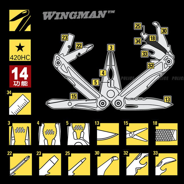 6.)木頭/金屬銼刀、7.)開罐器、8.)開瓶器、9.)420HC半齒半刃刀、10.)剝線器、