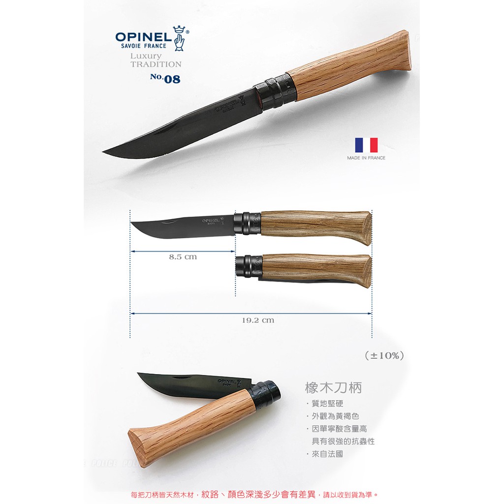 | ※本產品說明,僅供參考,請勿作為正式採購招標規格,如有需要,請來電我司洽詢相關業務人員。 ※以下原廠提供參考數據。 品名:OPINEL N°08 Black Oak 不鏽鋼黑刃折刀/橡木刀柄 型號/顏色:#OPI_ 002172 黑刃 尺寸( ±10﹪):刀刃長8.5 cm、全長約19.25 cm 重量( ±10﹪):47g 》不銹鋼刀刃系列 ˙Sandvik山特維克不銹鋼 ˙不銹鋼黑色刀刃比傳統的不銹鋼刀刃更抗腐蝕性 ˙viroblocR安全旋轉鎖定扣採用不銹鋼製成 ˙質感非凡 》橡木刀柄 ˙質地堅硬 ˙外觀為黃褐色 ˙因單寧酸含量高 具有很強的抗蟲性 ˙來自法國 ※未滿18歲 兒童及少年,請勿購買刀械。 |