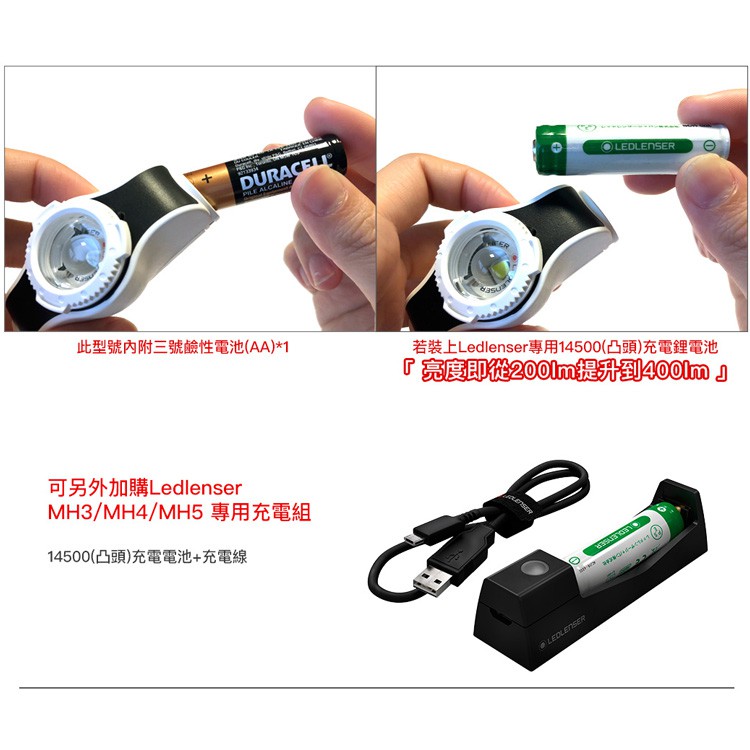 MH3 只需使用1顆三號電池,也可另購凸頭的14500充電鋰電池,使用14500電池時最高亮度更可達400lm,