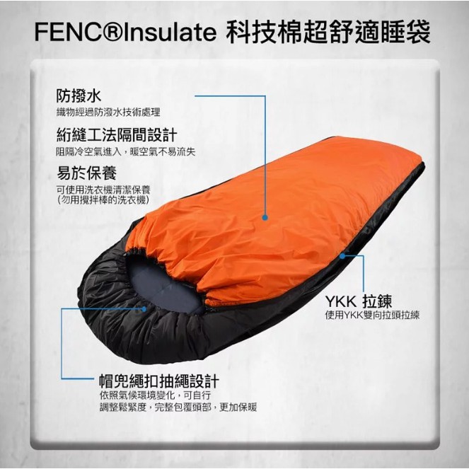 【舒適內裡】使用高品質天鵝絨,消除剛進入睡袋時冷感。布面刷毛處理可以有效提高保暖效果之外,布料處理3M Scotchgard™濕度管理,提升消費者的舒眠體驗。更進一步,我們在裡布處理Polygiene銀離子抗臭,能有效抑制汗臭味的產生,且效果持久,不隨洗滌減退。