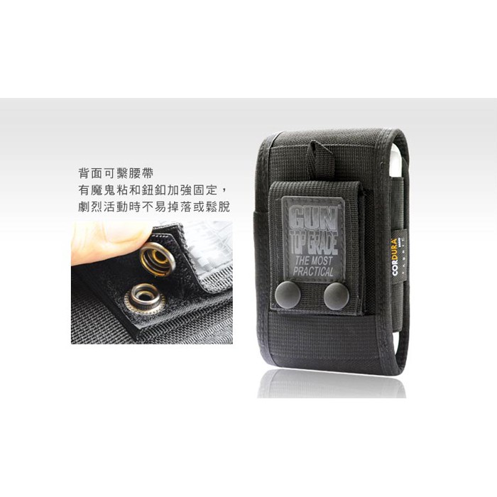 背面可繫腰帶有魔鬼粘和鈕釦加強固定,劇烈活動時不易掉落或鬆脫。