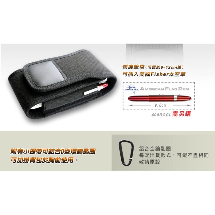 品名:GUN智慧型手機套,約4. 3~5.5吋用,不含外加保護套(殼) 型號:G-263 外觀顏色:黑色 材質:使用1000丹 CORDURA 尼龍布材質,布料表面再經 Dupont Teflon 處理,抗水耐磨不易撕裂。 尺寸(±10%):長約14.4cm × 寬約8.1cm × 厚約5cm 重量(±10%):約72公克(空) 附件:D型環鑰匙圈 × 1個 產地:台灣 |