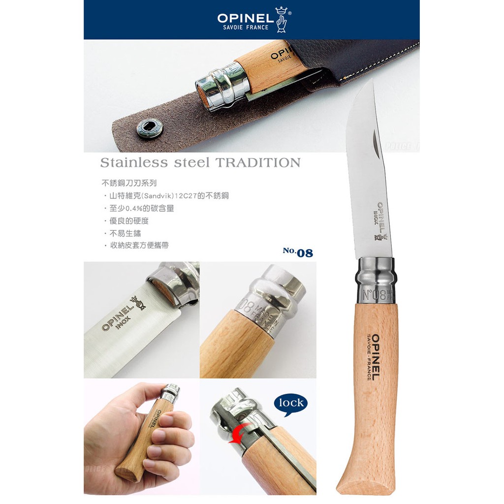 丹大戶外【OPINEL】No.08 不鏽鋼折刀/櫸木刀柄/新皮套組合 OPI 001089│刀子│鋼刀│小刀│折疊刀