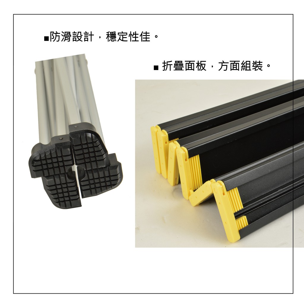 • 折疊輕鬆組裝,支架先攤開成型,腳墊朝地,再把桌面安裝在支架上方即成。